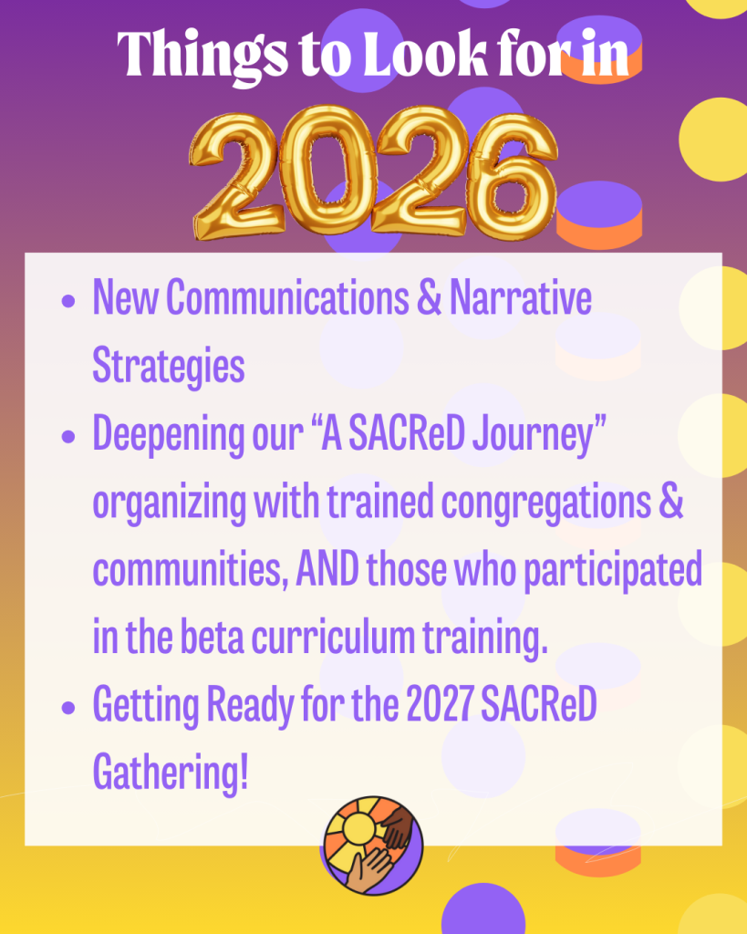 In 2026 we’re working on: New Communications & Narrative Strategies Deepening our “A SACReD Journey” organizing Getting Ready for the 2027 SACReD Gathering! And more!