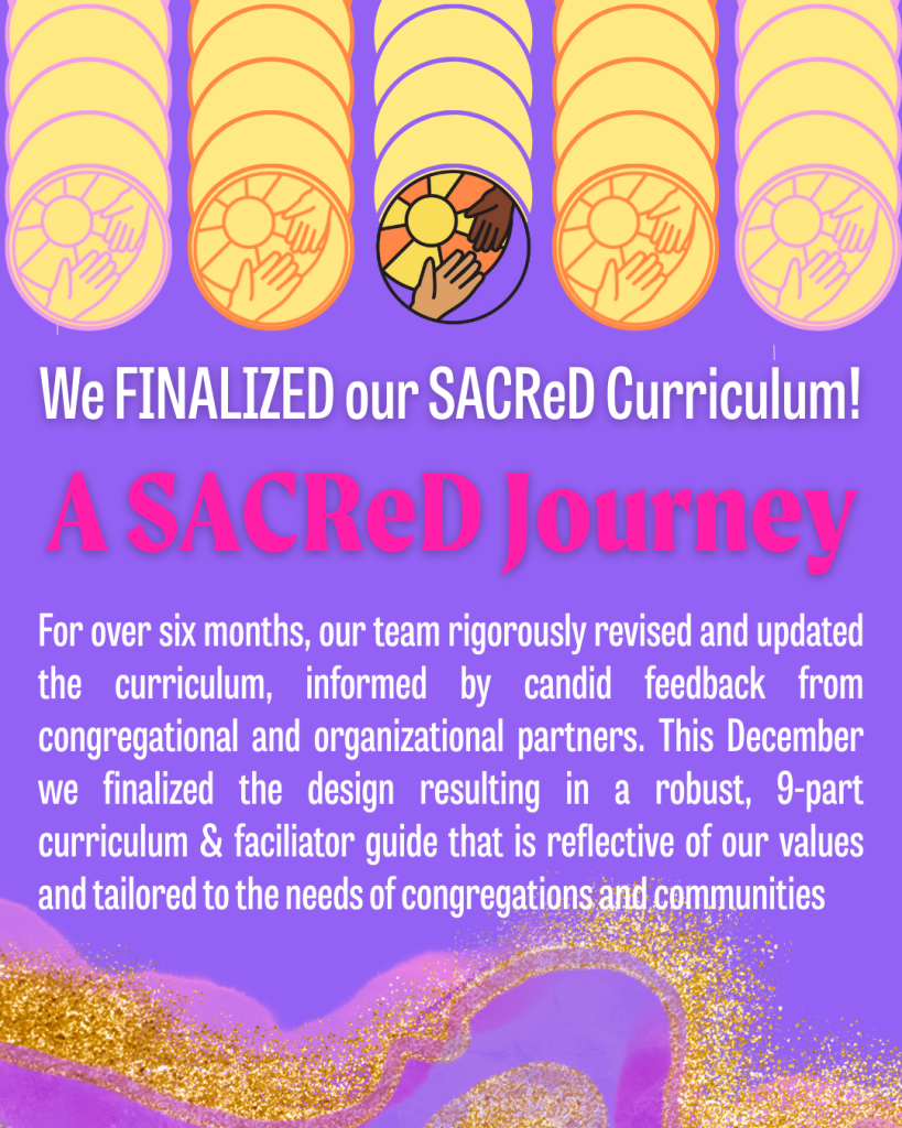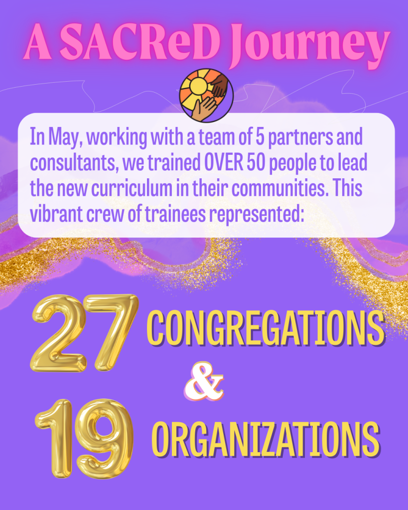 In May of 2025 we trained over 50 people to lead this curriculum–many of those trainees are getting ready to lead their communities through the curriculum right now! Across the last four years we’ve trained over 500 Spiritual Leaders and Community Organizers in a version of the SACReD Curriculum.